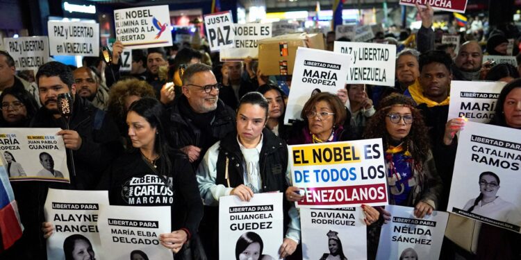 The crowd in Peru’s capital, Lima, carried portraits of Machado and demanded a “Free Venezuela”. With the country’s yellow, blue and red flag draped over their backs or emblazoned on their caps, demonstrators clutched posters that read, “The Nobel Prize is from Venezuela.”