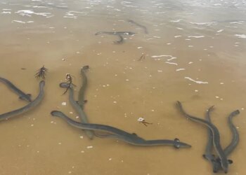 Hundreds of short-finned eels put on a wild, wiggly show on an Australian beach in the city of Warrnambool in ...