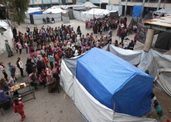 Nuseirat, Gaza Strip – Nibal Abu Armana sits in her tent, where she has been teaching her seven-year-old son, Mohammed, ...