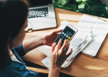 Close up Business woman using calculator and laptop for do math finance on wooden desk in office and business working ...