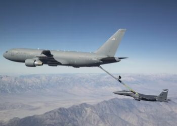 Boeing’s KC-46A Pegasus tanker refuels an F-15E aircraft during Phase II receiver certification testing out of Edwards Air Force Base, ...