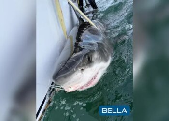 Timelapse video shows great white shark Bella getting tagged and released into Mahone Bay, Nova Scotia, in July 2025. She ...