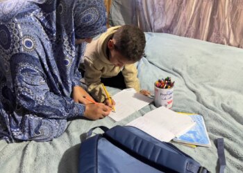 Nuseirat, Gaza Strip – Nibal Abu Armana sits in her tent, where she has been teaching her seven-year-old son, Mohammed, ...