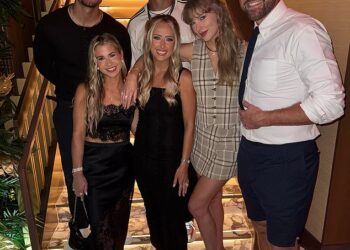 Taylor Swift puts on a leggy display in a sizzling mini skirt as she joins fiance Travis Kelce at birthday bash