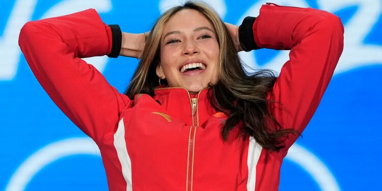 China’s Eileen Gu reacts at the Milano Cortina 2026 Winter Olympics in Italy. Monday, Feb. 9, 2026. (David Davies/PA Images via Getty Images)