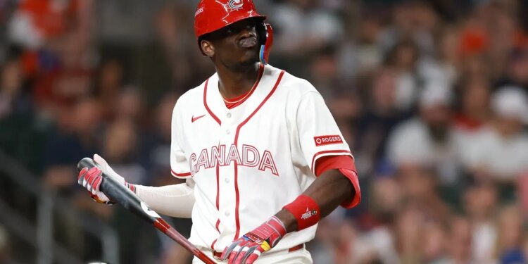 Denzel Clarke #1 of Team Canada reacts after striking out during the fifth inning against Team United States at Daikin Park on March 13, 2026, in Houston, Texas. (Kenneth Richmond/Getty Images)