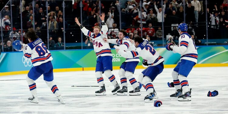 Jack Hughes (86) of the United States celebrates with teammates after scoring the game-winning goal against Canada in the men’s ice hockey gold medal game during the Milano Cortina 2026 Olympic Winter Games at Milano Santagiulia Ice Hockey Arena on Feb. 22, 2026. (Geoff Burke/Imagn Images)