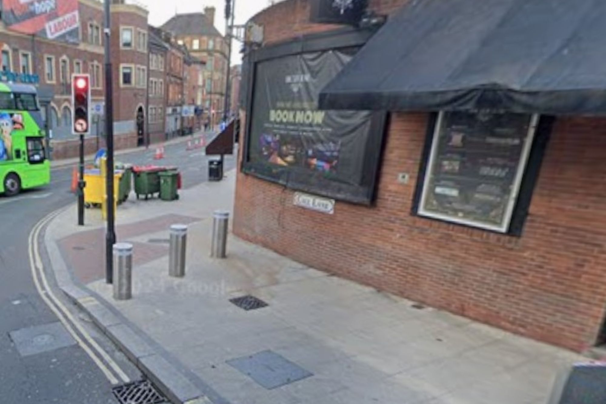 Street view of the entrance to Code Lane, with a building on the right displaying "BOOK NOW" and "CODE LANE" signs.
