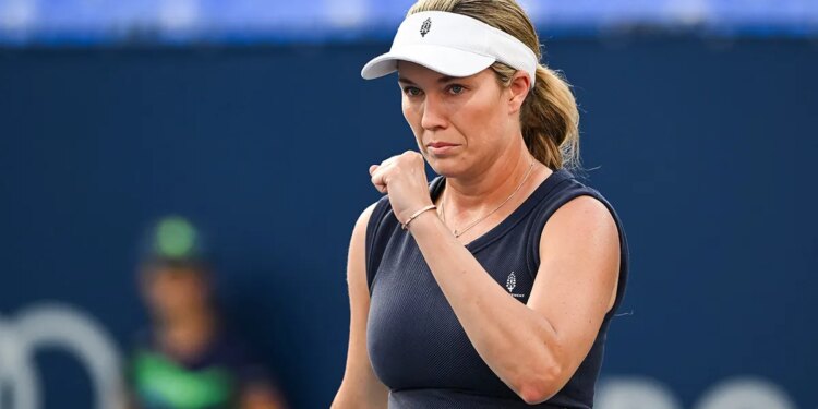 Danielle Collins (USA) reacts after scoring a point against Viktoriya Tomova (BUL) in first round play at IGA Stadium on July 27, 2025. (David Kirouac/Imagn Images)