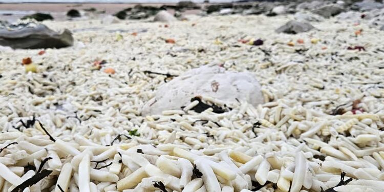 TENS of thousands of uncooked potato chips have washed up on the beach at a popular beauty spot.