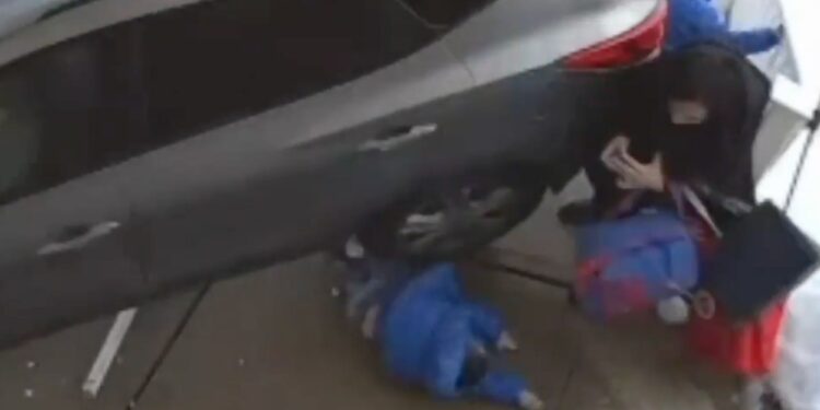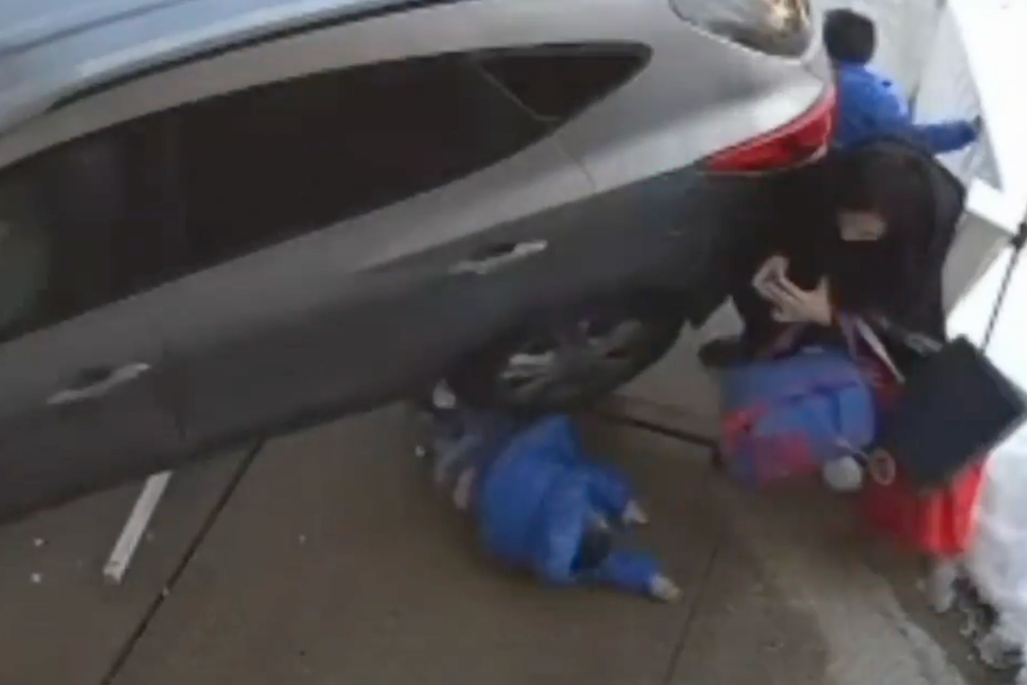 The SUV continues rolling forward, slamming into Pisani and her other son, forcing them to the ground and pinning them against a metal railing.