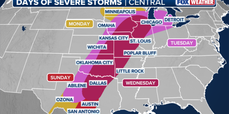 TEXAS – Another round of severe storms is headed for the southern U.S. this week, with parts of Texas vulnerable to significant flash flooding Sunday night.