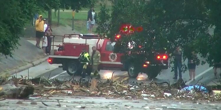 First responders survey rising flood waters of the Guadalupe River after flash flooding in Kerr County, Texas, U.S. July 4, 2025 in a still image from video. (ABC Affiliate KSAT via REUTERS)