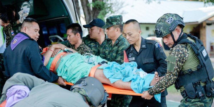 In this photo released by Royal Thai Army, a wounded Thai soldier is carried to be transferred to a hospital in Sisaket province, Thailand, Sunday, Dec. 7, 2025, after, according to a Thai army spokesperson, Cambodian troops fired into Thai territory. (Royal Thai Army via AP)