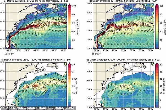 Lead author Dr René van Westen told the Daily Mail: ‘What is most important is that most AMOC reconstructions suggest that the AMOC is weakening under climate change, with the northward shifting Gulf Stream also being a sign for AMOC weakening.
