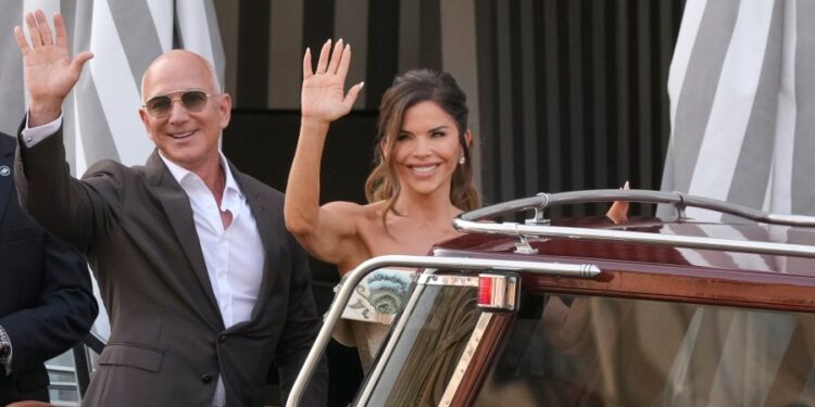 A string of water taxis cut through the lagoon to bring Bezos, Sánchez Bezos and their guests to the tiny San Giorgio island, across the lagoon basin from St. Mark’s Square, where the couple held their private ceremony. Paparazzi in their own boats followed close behind in a controlled chase, trying to capture the couple and their guests on camera, as police on personal watercraft patrolled a no-go zone.