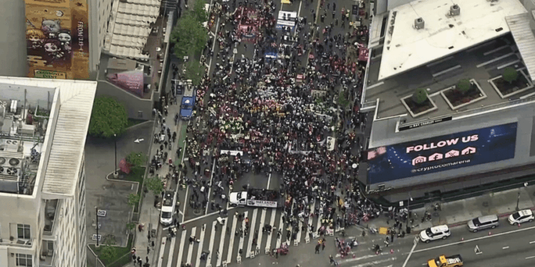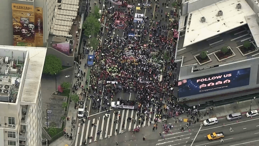 “It’s loud and it’s crowded,” KTLA’s Eric Spillman said as he stood at the corner of South Figueroa Street and West Olympic Boulevard at 10 a.m.