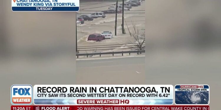 Over 6 inches of rain fell in Chattanooga, Tennessee on Tuesday, the city’s second-wettest day on record after thunderstorms dropped heavy rain ahead of a cold-front that moved through the region.