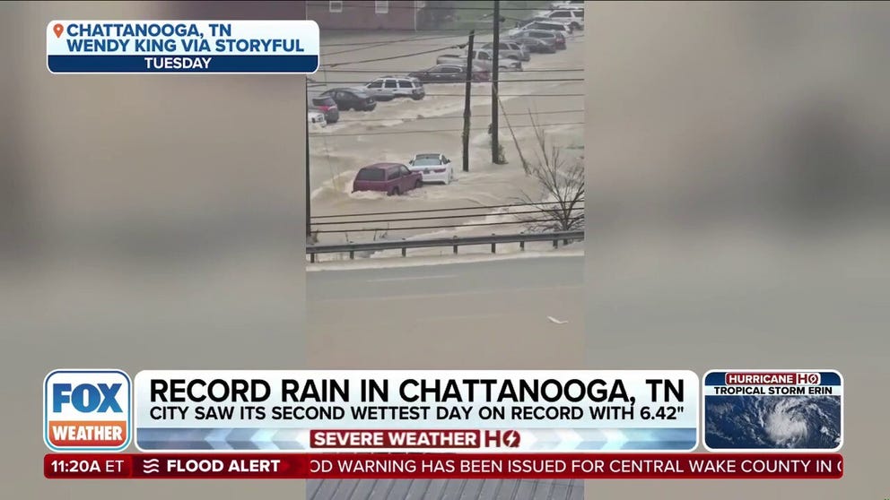 Over 6 inches of rain fell in Chattanooga, Tennessee on Tuesday, the city's second-wettest day on record after thunderstorms dropped heavy rain ahead of a cold-front that moved through the region.