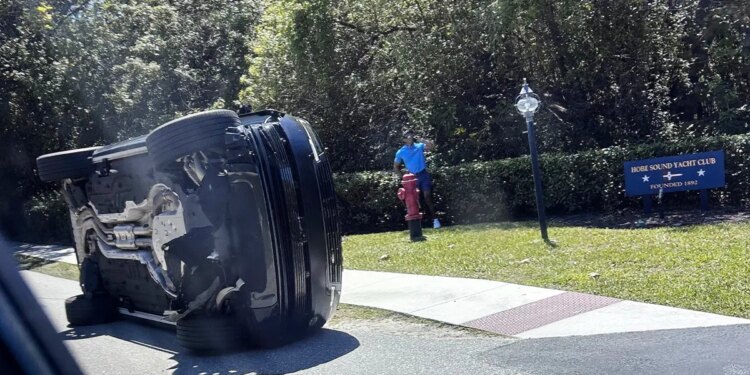 Golfer Tiger Woods stands by his overturned vehicle in Jupiter Island, Fla., Friday, March 27, 2026. (Jason Oteri/AP)