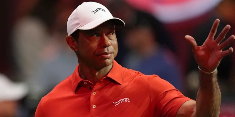 Tiger Woods of Jupiter Links Golf Club waves to fans as he is introduced at the start of a match of the TMRW Golf League against Boston Common Golf Jan. 27, 2025, in Palm Beach Gardens, Fla. (AP Photo/Rebecca Blackwell)