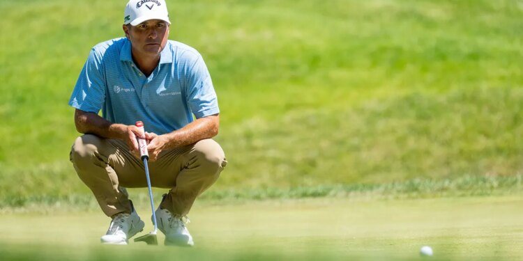 Kevin Kisner lines up his putt on the 9th hole during the first round of the John Deere Classic golf tournament on July 3, 2025. (Marc Lebryk/Imagn Images)