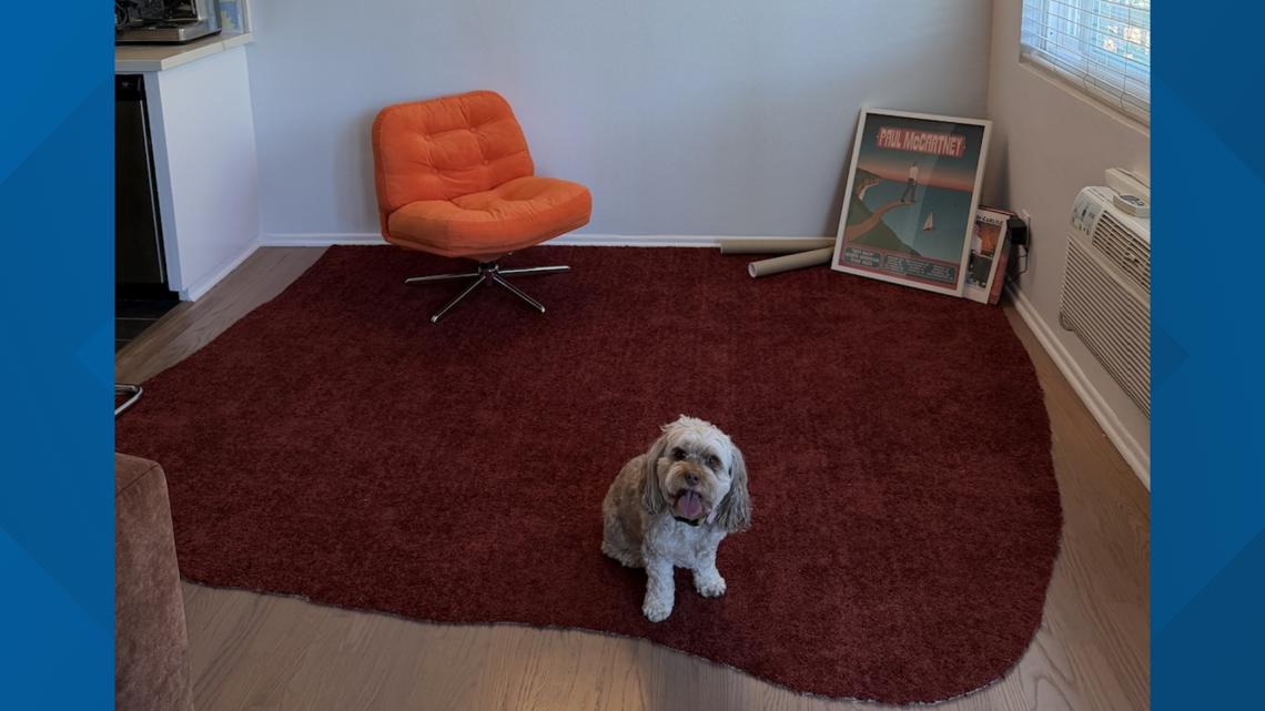 A crafty content creator, Thalia was able to cut up the carpet to make the piece fit inside her studio apartment. Now, Thalia’s pet dog, Cove, can be seen lounging on the rug.