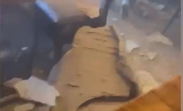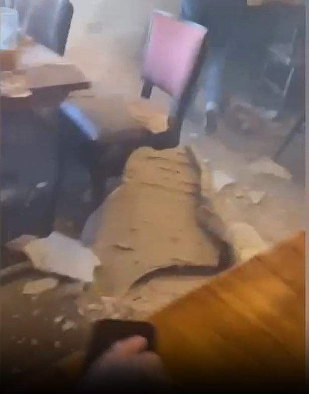Footage from inside the restaurant shows the aftermath of the collapse, with rubble strewn across the floor.