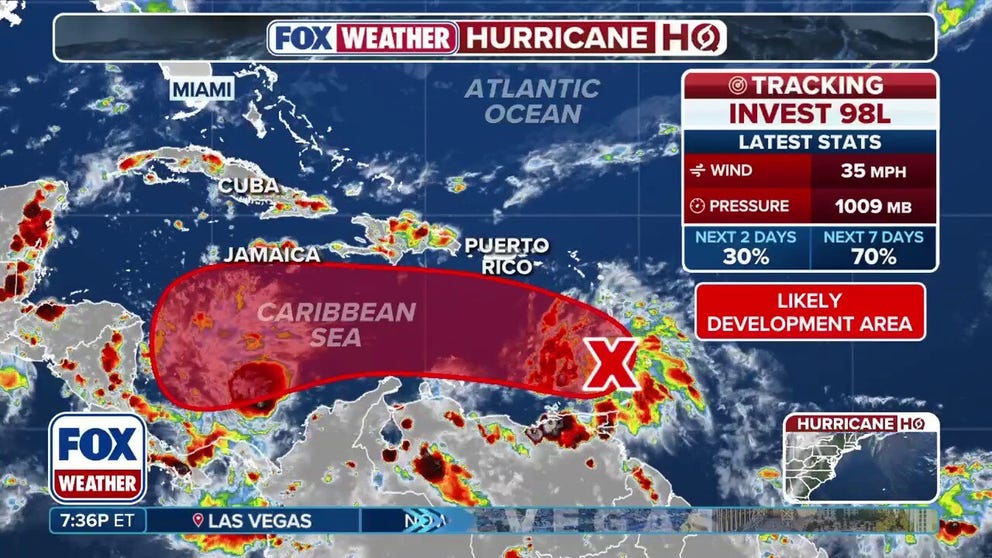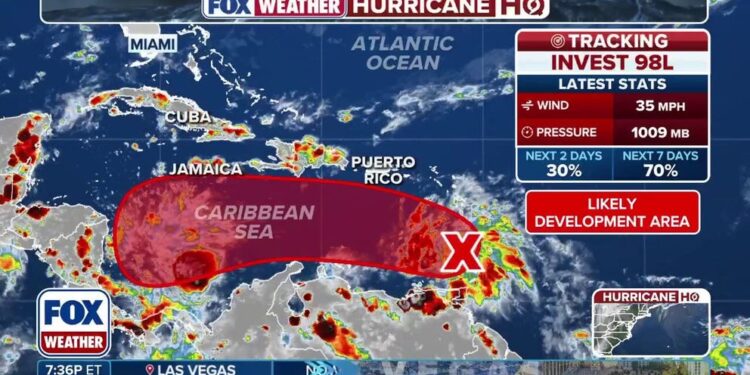 Forecasters are continuing to monitor the development of Invest 98L as the organizing system swirls across the Caribbean, and it’s looking more likely that it will become a tropical depression or Tropical Storm Melissa in the coming days.