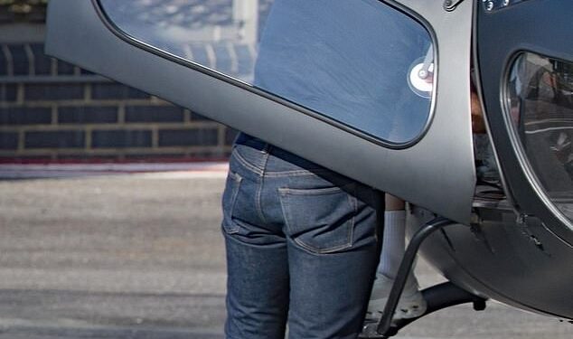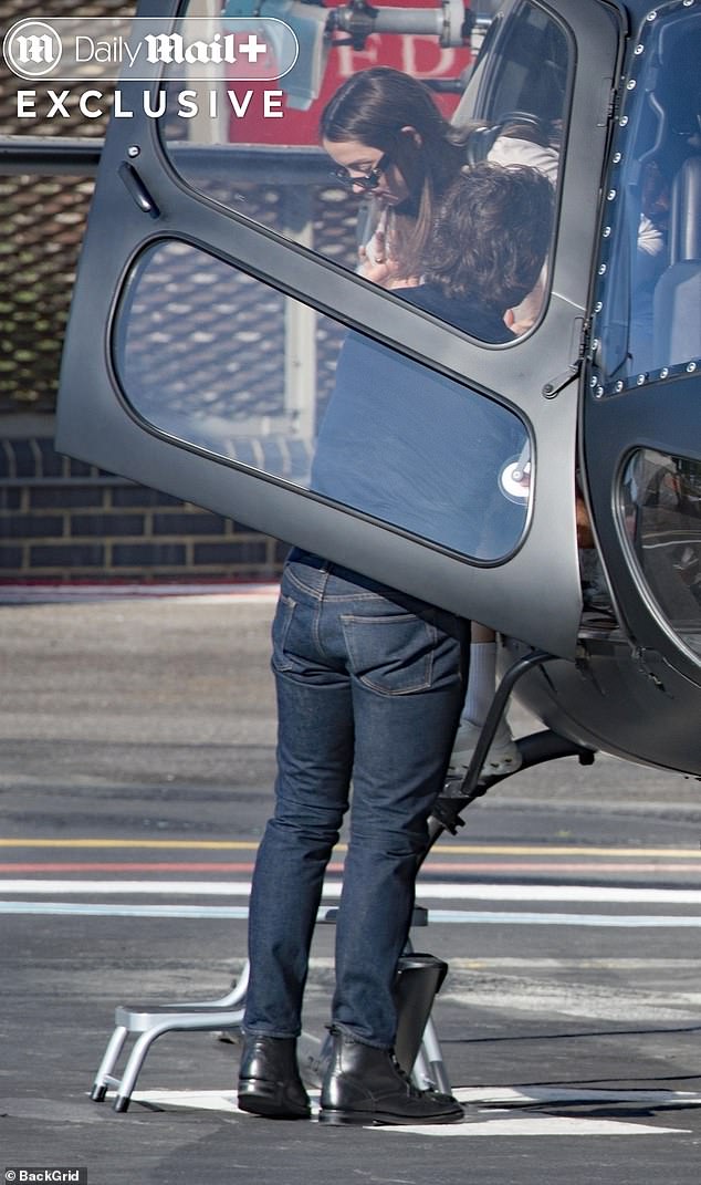 Meanwhile Top Gun star Cruise flaunted his action-man credentials as he landed the chopper and showed off a buff frame in a tight tee and jeans.