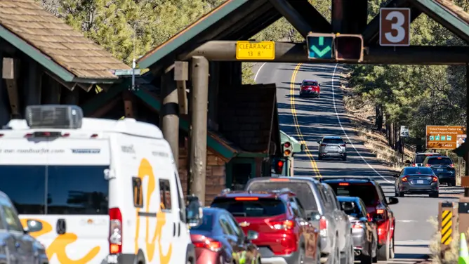 GRAND CANYON, ARIZONA – FEBRUARY 23: Vehicles wait in line at an entrance to the Grand Canyon National Park on February 23, 2025 in Grand Canyon, Arizona.