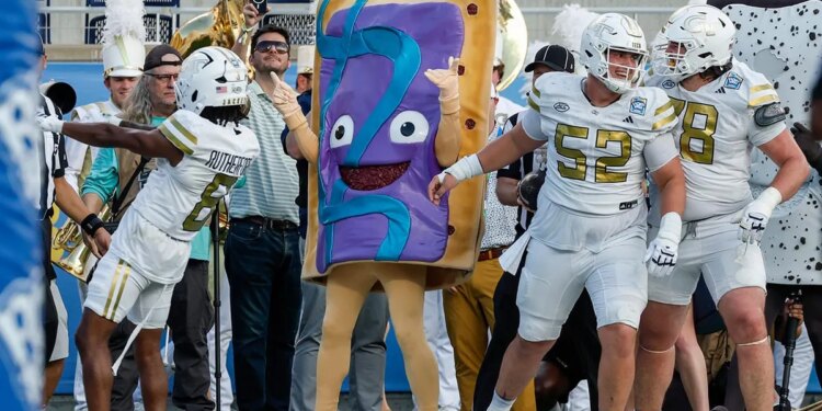 Georgia Tech celebrates a touchdown with the Pop-Tarts mascot against BYU during the first half of the Pop-Tarts Bowl Saturday, Dec. 27, 2025, in Orlando, Fla. (AP Photo/Kevin Kolczynski)