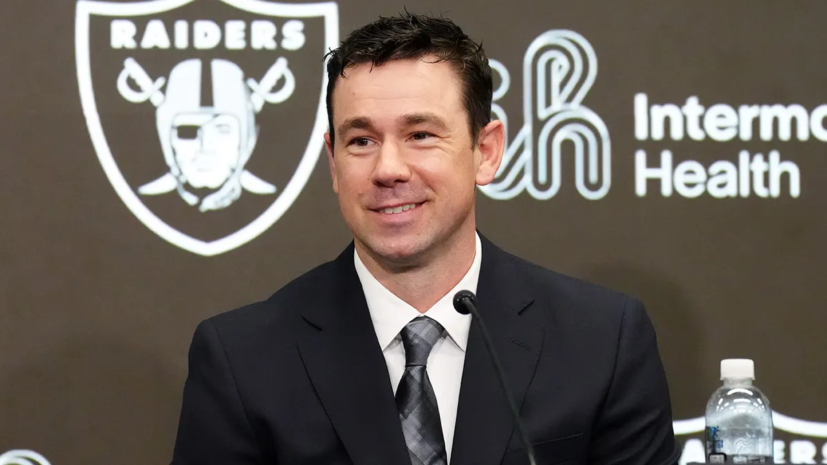 Las Vegas Raiders coach Klint Kubiak speaks at an introductory news conference at Intermountain Health Performance Center on Feb. 10, 2026, in Henderson, Nev. (Kirby Lee/Imagn Images)