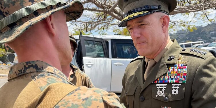 Marine Gen. Francis L. Donovan, commander of U.S. Southern Command, engages with Marines assigned to stand watch at U.S. Embassy facilities in Caracas, Venezuela, on Wednesday, Feb. 18, 2026. (U.S. Southern Command/Venezuela Affairs Unit )