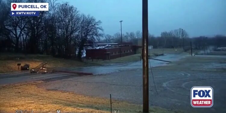 PURCELL, Okla. – A radar-confirmed tornado ripped across Interstate 35 and part of Purcell, Oklahoma on Thursday morning, knocking down power lines as a powerful line of thunderstorms barreled their way across the Southern Plains.