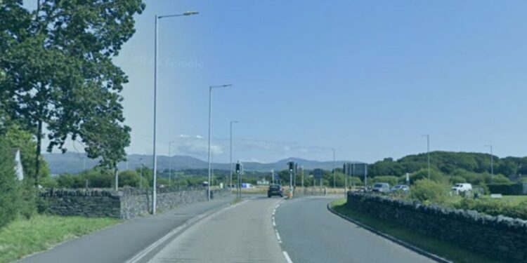 The A487 road near the Porthmadog bypass, with mountains in the background.