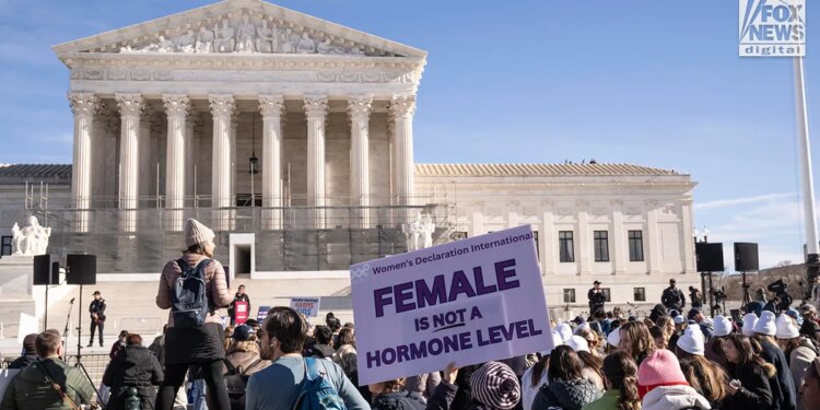 Groups of protesters stand in front of the Supreme Court of the United States as the Justices hear the landmark case to decide if transgender girls should be allowed to participate in girls’ and women’s sports on Tuesday, Jan. 13, 2026. Credit: Andrew Thomas / CNP (Andrew Thomas / CNP for Fox News Digital)