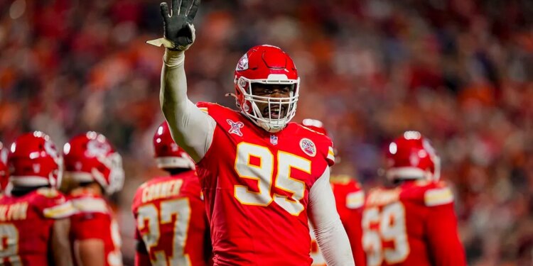 Kansas City Chiefs defensive tackle Chris Jones (95) gestures to the crowd during the third quarter at GEHA Field at Arrowhead Stadium on Dec. 25, 2025. (Jay Biggerstaff/Imagn Images)