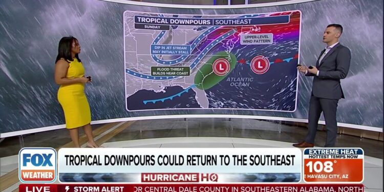 CHARLESTON, S.C. – Just as the heat dome that has kept the Southeast sweltering this week breaks down, tropical downpours will return to the region and bring with them a risk of flooding.
