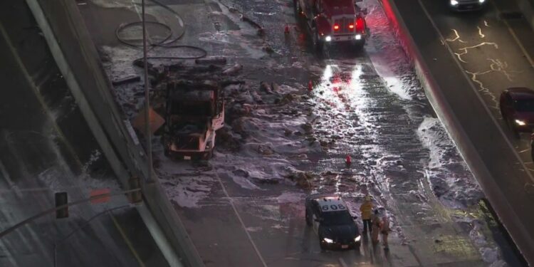 A flatbed truck loaded with bales of hay erupted in flames Monday night, shutting down a key freeway connector and backing up traffic for miles as firefighters and the California Highway Patrol worked to secure the scene. Sky5 captured the burned-out truck on the northbound 405 Freeway connector just south of the 101, where all […]