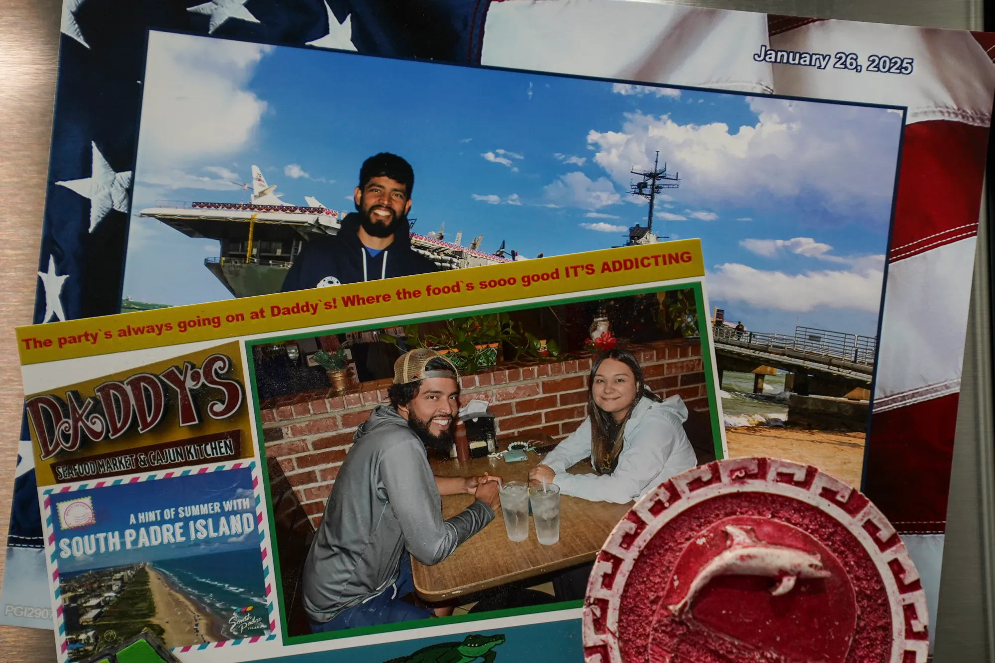 Photos of Stephanie Villarreal and her husband Juan Chávez Velasco on their refrigerator at their home in Welsaco. Gabriel V. Cárdenas for The Texas Tribune