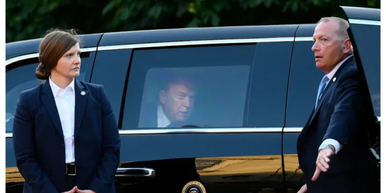 President Donald Trump (C) sits in his car “The Beast” as he arrives for a social dinner at the ‘Huis ten Bosch’ Royal Palace during a North Atlantic Treaty Organization (NATO) Heads of State and Government summit in The Hague. (Photo by JOHN THYS / AFP) (Photo by JOHN THYS/AFP via Getty Images)