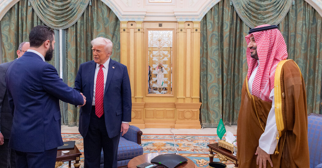 President Trump held an extraordinary meeting on Wednesday with the president of Syria, Ahmed al-Shara, a day after announcing that the United States would lift sanctions on his country — a move that would ease the economic stranglehold on a nation that is seen as central to the stability of the Middle East.