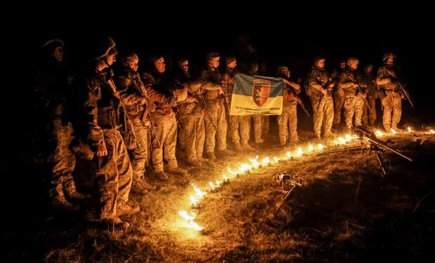 In this photo taken on March 21, 2025 and provided by Ukraine’s 24th Mechanized Brigade press service on March 24, 2025, servicemen attend a dedication ceremony for soldiers near the frontline in the Donetsk region, Ukraine. (Oleg Petrasiuk/Ukraine’s 24th Mechanized Brigade via AP)
