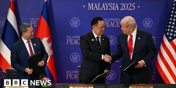Describing the two slightly sheepish-looking prime ministers who were about to sign the deal as “historic figures”, Trump recalled at length how he got involved in the Thai-Cambodian border conflict while he was visiting his Turnberry golf course in Scotland in July.