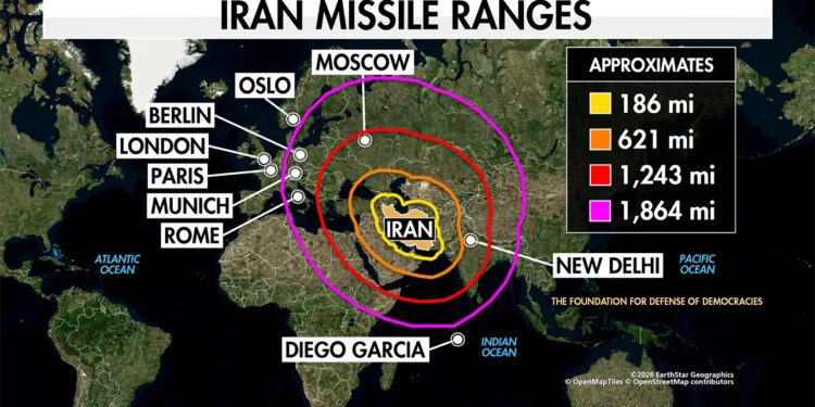 Map from the Foundation for Defense of Democracies showing Iran’s missile ranges. (The Foundation for Defense of Democracies)