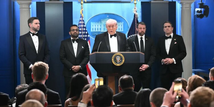 Flanked by tuxedo wearing VP JD Vance, FBI Director Kash Patel, DHS Secretary Markwayne Mullin and Acting Attorney General Todd Blanche back at the White House, Trump started his remarks Saturday with an understatement of “that was very unexpected.”