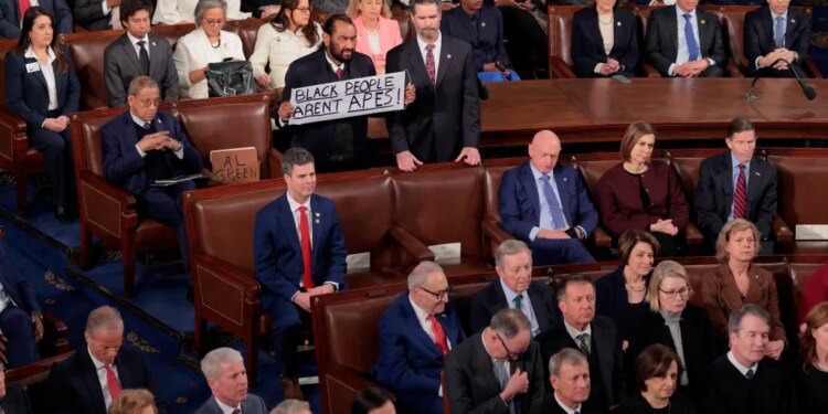 Green held up a sign that read “Black People Aren’t Apes, as Trump entered the floor of the House of Representatives to deliver the first State of the Union of his second term. When Trump and his entourage of GOP leaders walked down the aisle, Majority Leader Steven Scalise tried unsuccessfully to tear the sign down.