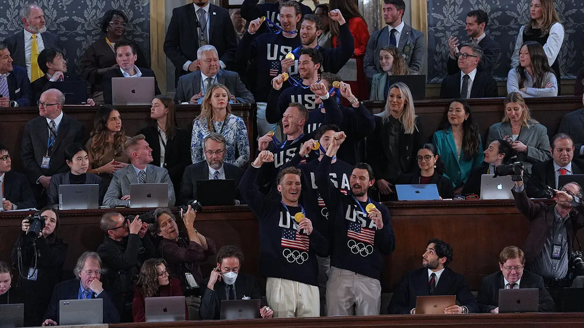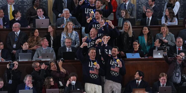 Members of the United States’ men’s Olympic hockey team attend as President Donald Trump delivers the State of the Union address to a joint session of Congress in the House chamber of the U.S. Capitol in Washington Tuesday, Feb. 24, 2026. (AP Photo/Matt Rourke)
