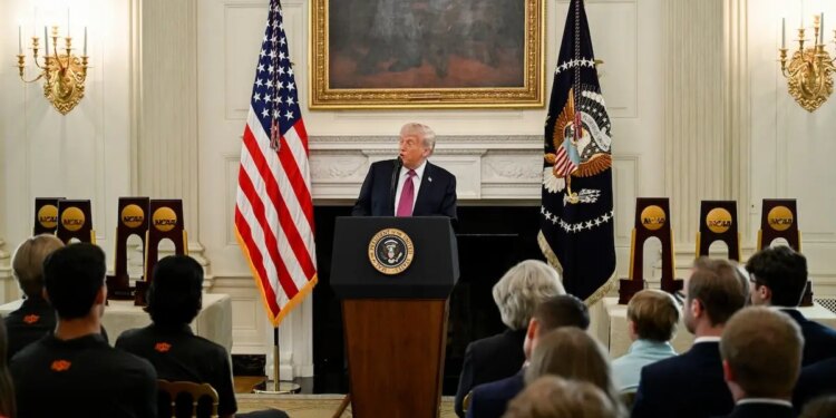 Trump made the comments while honoring the NCAA champion Youngstown State bowling, Oklahoma State men’s golf, Texas A&M women’s volleyball, Wake Forest men’s tennis, Georgia women’s tennis, West Virginia mixed rifle and Florida State women’s soccer teams.